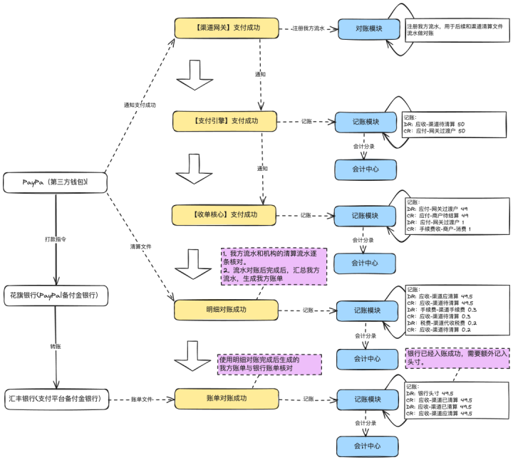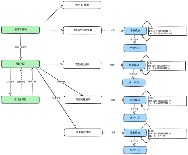 说明:图中只画了正常场景,像明细对账出现差异(长短款)、账单对不平(渠道少打款或多打款)等场景没有画出来。