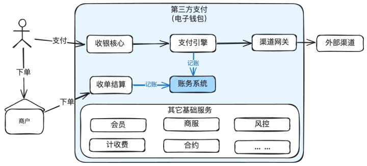 上面的业务系统只画了支付链路的示例,实际业务可能还有充、转、提等资金产品服务。