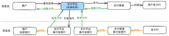下面分别以最常见的支付来展开说明信息流和资金流。钱包账户余额充值和余额支付会有一些差别,但原理差不多,在此处略过。