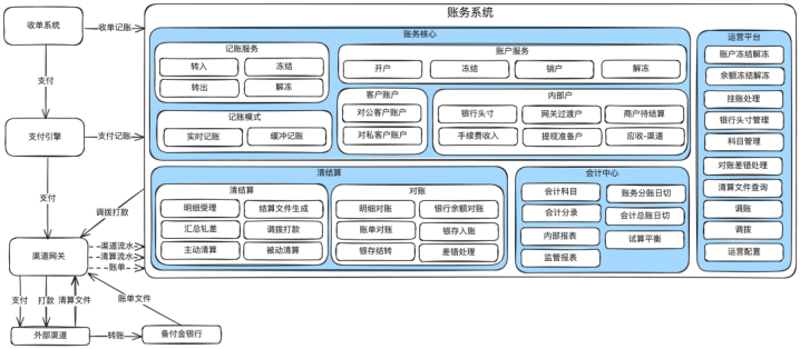 各公司对账务系统子模块的拆分可能有差异,比如有些公司把账户和记账服务单独拆成两个模块,或者把对账从清结算模块中拆出成单独的一个对账核心。这些拆分不影响本质的东西。