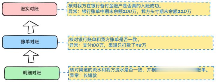 第一层是信息流对账。我方流水和银行清算文件的流水逐一核对。可能会存在长短款情况。