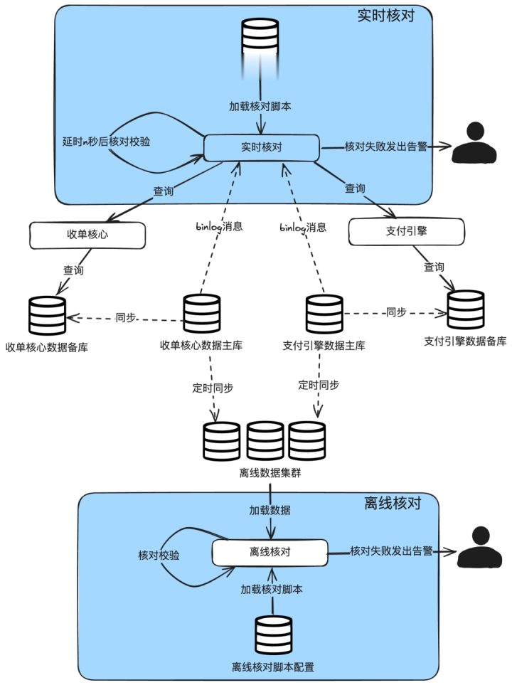 再细分,还可以拆成离线核对和实时核对。离线核对一般就是把生产数据库的数据定时清洗到离线库(一般还可以分为天表和小时表)。实时核对一般就是监听数据库的binlog,当数据有变动时,延时几秒后请求双方系统的查询接口,查到数据后进行核对。