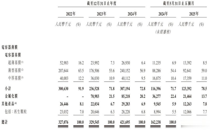 海伟电子2025年前5个月来自电容器基膜收入1.23亿,占比为78.5%;主要来自薄型基膜,薄型基膜收入为9264万元,占总营收的比例为59%。