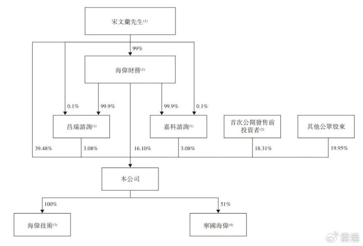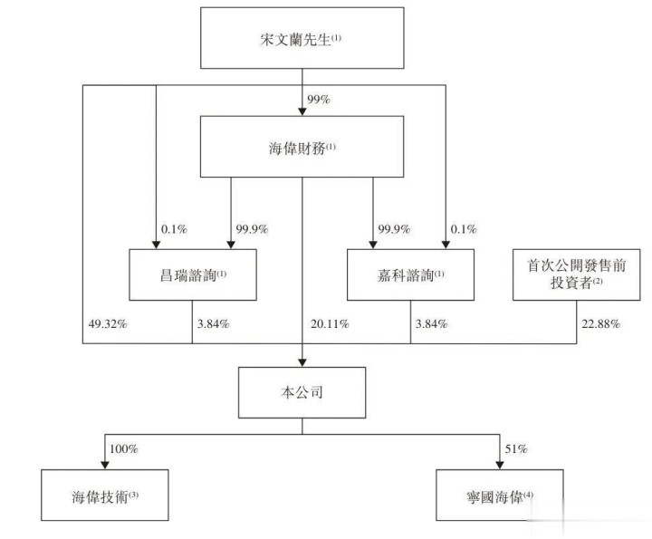 IPO前,宋文兰、海伟财务、昌瑞咨询以及嘉科咨询分别直接持有公司已发行股本总额约49.32%、20.11%、3.84%及3.84%。由于海伟财务由宋文兰拥有99%权益;昌瑞咨询由宋文兰作为有限合伙人拥有0.1%权益,及由海伟财务作为普通合伙人拥有99.9%权益。